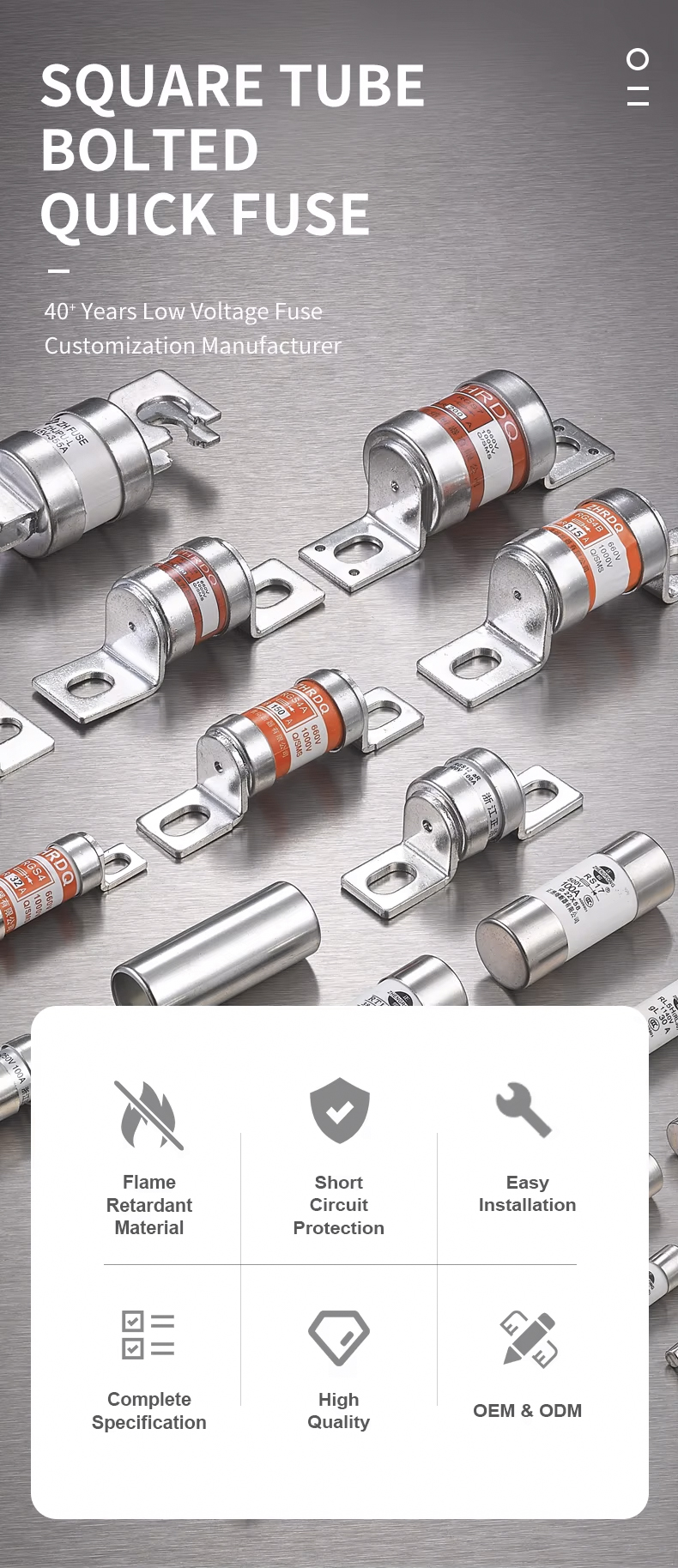 RS0/RS3-50 500V sikringen er en firkantrør boltet hurtigsikring, med en mærkespænding på 500V og en brudkapacitet på 50ka, som har god sikkerhedsgaranti.