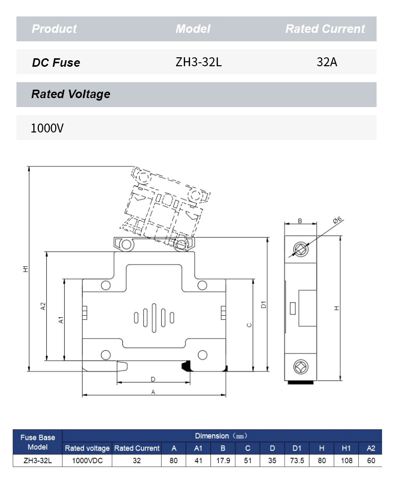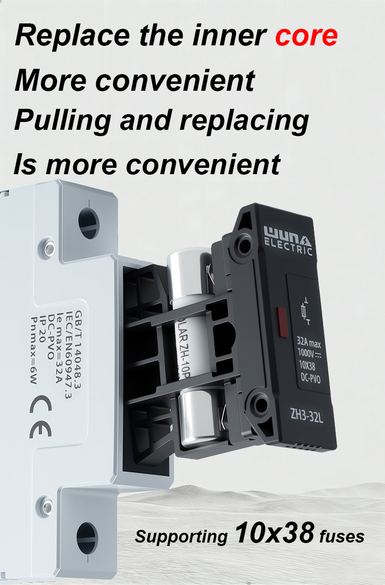 ZH32L DC 1000V sikringsholderen er en højtydende komponent designet til at sikre pålidelig beskyttelse af elektriske kredsløb i fotovoltaiske og andre DC-applikationer. Med robust konstruktion og overlegen isolering er ZH32L DC 1000V sikringsholderen velegnet til sikkert at huse sikringer op til 1000V DC, hvilket effektivt forhindrer overstrøm og kortslutningsskader.