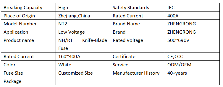 ZHENGRONG NT2 315A 500V Firkantede keramiske sikringer bruges almindeligvis i industrielt elektrisk udstyr, strømsystemer og elektronisk udstyr for at beskytte kredsløb mod overbelastning og kortslutninger.