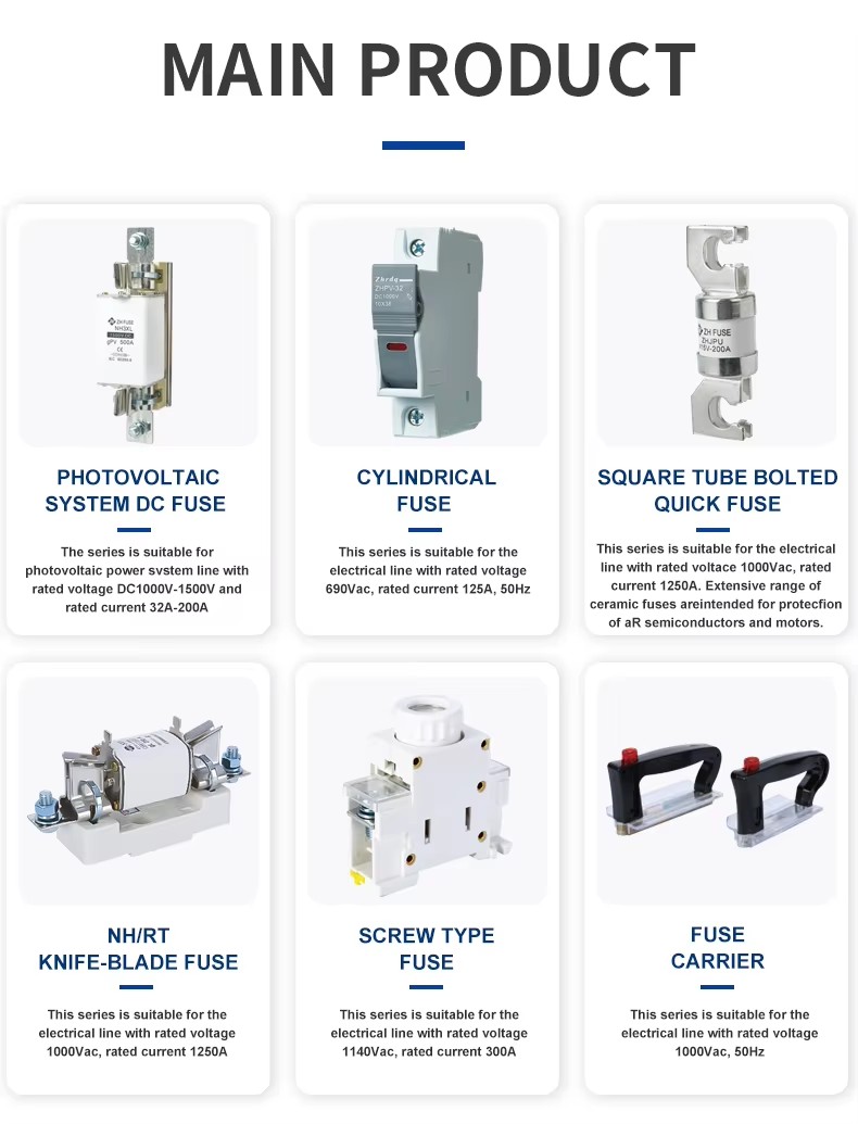 De strukturelle egenskaber ved ZHPV-125 1000V DC-sikringsbasen og sikringsforbindelser 22 × 58 mm cylindrisk keramisk sikringsbund i det fotovoltaiske system er som følger. Denne række sikringer består af et sikringslink og en sikringsholder. Den variable tværsnit sikringsorgan lavet af rent kobberplade (eller kobbertråd, sølvtråd, sølvplade) er forseglet i et sikringsrør lavet af højstyrke keramisk eller epoxyglasklud rør, fyldt med kemisk behandlet højryghedskvartsand som et lysbue-slukket medium. De to sider af sikringskernen er pålideligt forbundet til slutpladen gennem spot -svejsning og danner en cylindrisk hættformet struktur. ZHPV-125 1000V DC Sikringsbasen er lavet af harpiks eller plastskal presset med elektrisk stød, inklusive et sikringselement, der er forbundet med at nitre som en understøttelse af den passende størrelse sikrings kropskomponent. Denne række sikringer har fordelene ved lille volumen, let installation, sikker brug og smukt udseende.